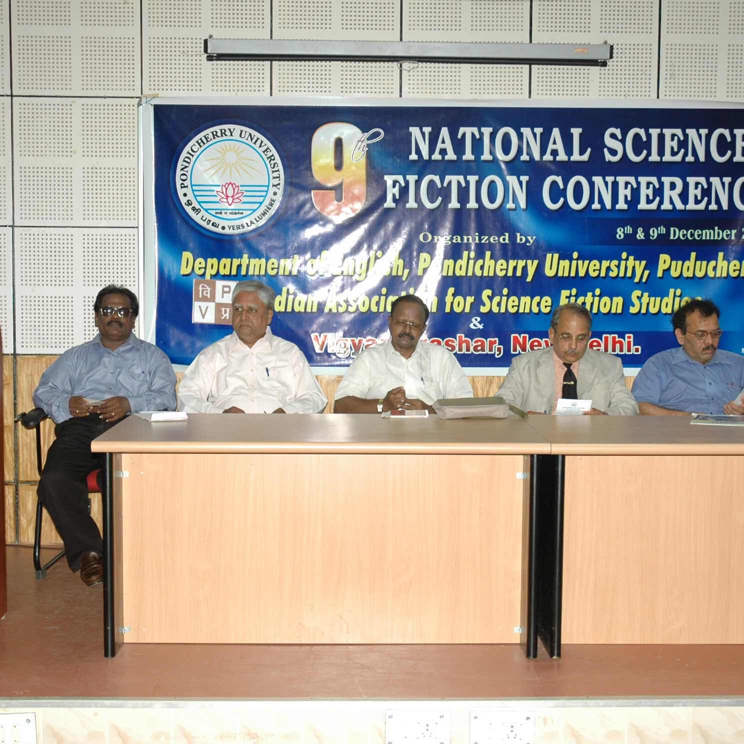 The 9th National Science Fiction Conference was held December 8-9, 2007 at Pondicherry University in Puducherry, India. Vignyan Prasar (an organization for the popularization and propagation of science & technology, and an autonomous body under the Department of Science & Technology in the Indian government) and the Department of English at Pondicherry University joined with the Indian Association for Science Fiction Studies (IASFS) in organizing the conference. More than 200 delegates from various parts of India, students of the University, and two Americans representing NakedLaw.org actively took part during the sessions. The inaugural function was followed by eight sessions of 28 paper presentations with themes including “Science in Science Fiction”, “Science Fiction Today”, “Science Fiction Theme: Time”, “Science Fiction: The Human Aspect”, a story reading session, a replay of a video conference featuring James Gunn, “Science Today”, “Science Fiction in Vernacular Languages”, and a concluding valedictory function.